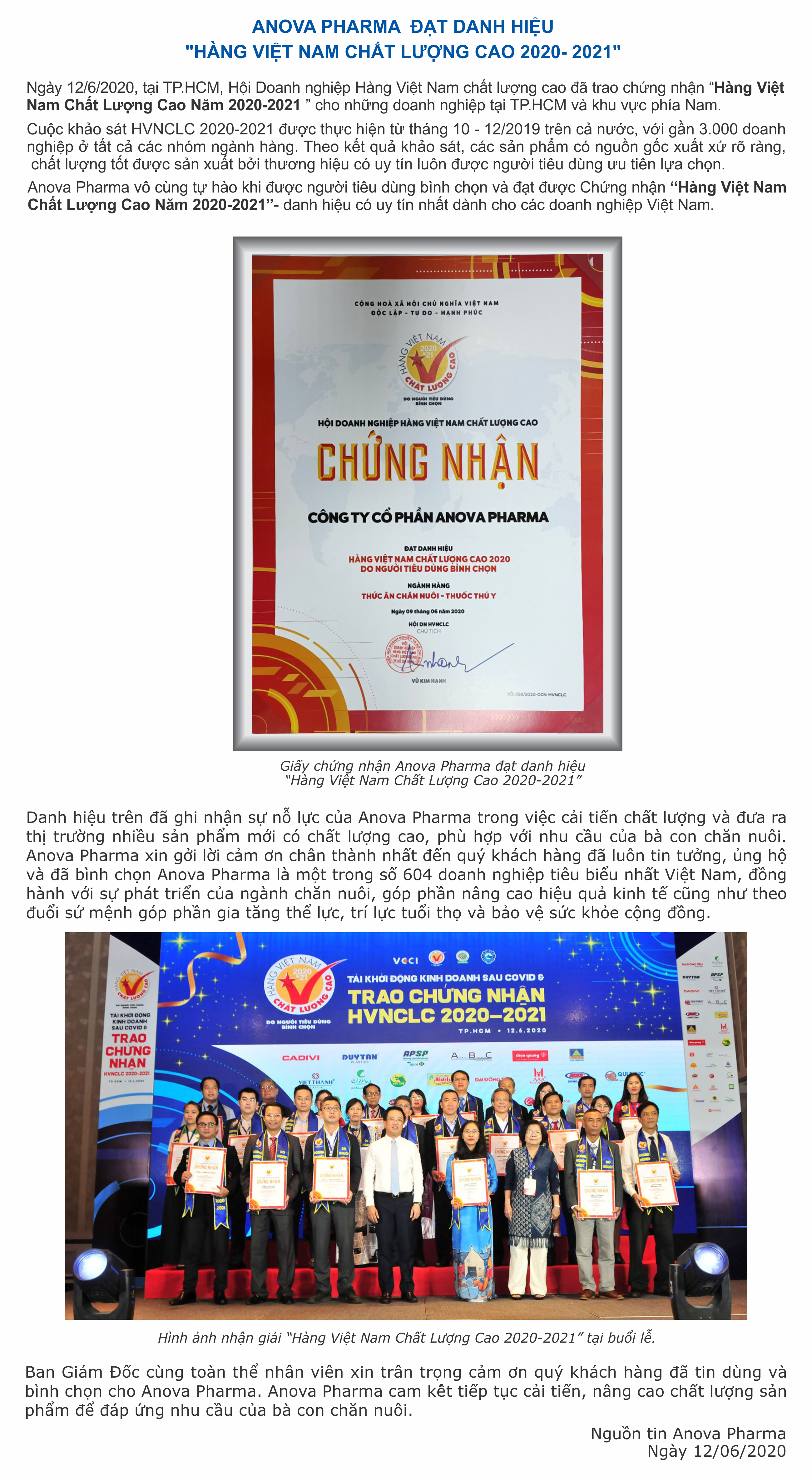 ANOVA PHARMA ĐẠT DANH HIỆU "HÀNG VIỆT NAM CHẤT LƯỢNG CAO 2020-2021"