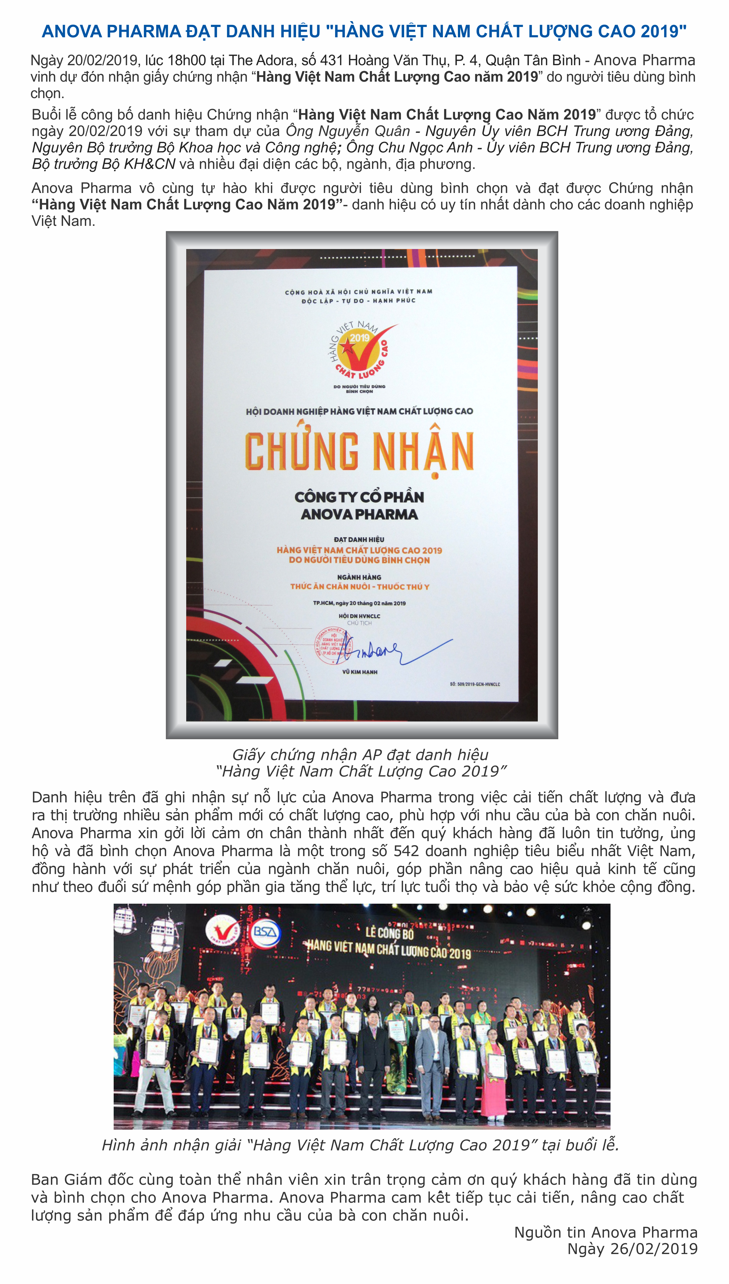 ANOVA PHARMAP ĐẠT DANH HIỆU "HÀNG VIỆT NAM CHẤT LƯỢNG CAO 2019"